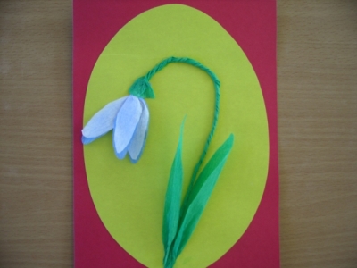 - Wir kleben unser Schneeglöckchen auf Papier oder eine Postkarte, wir zeichnen einen Stiel und Blätter mit Stiften oder Markern. Schneeglöckchen ist fertig!