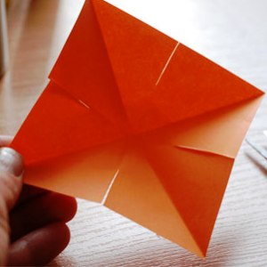- Lassen Sie uns anfangen, unser Handwerk, Frühlingsblumenstrauß, mit der Bildung einer Knospe einer Tulpe zu schaffen . Um dies zu tun, biege das Blatt aus farbigem Papier diagonal in zwei Hälften, dann dehne und falte es wieder in der Mitte, aber auf der anderen Diagonale. Machen Sie Falten auf Papier, indem Sie es in zwei Hälften biegen. Als Ergebnis erhalten Sie ein Blatt, aus dessen Mitte acht Strahlen bestehen. Machen Sie vier kleine Schnitte in vier kurzen Strahlen.