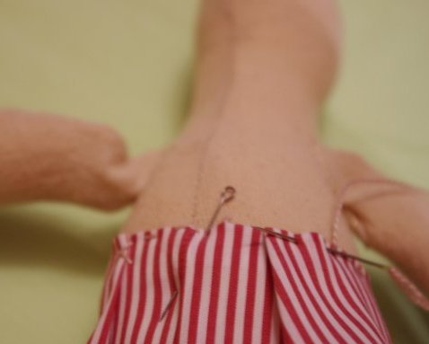 14. Wir befestigen das Höschen an den Körper und nähen es mit einem Faden im Ton der Kleidung.