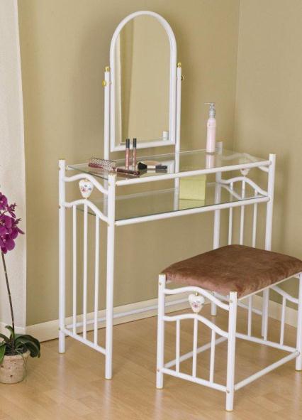 Wo es weniger Tische aus Metall gibt. Sie können geschmiedet oder aus hohlen Metallrohren hergestellt werden, die unter der Stoffpolsterung verborgen sind. Platzieren Sie in diesem Fall keinen Tisch im Badezimmer - diese Modelle sind speziell für Schlafzimmer oder Umkleidekabinen konzipiert.
