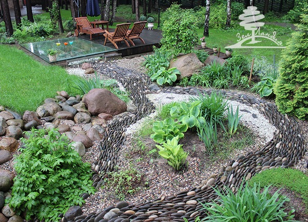Die Idee, einen trockenen Bach mit einer Brücke zu schaffen, ist sehr verbreitet. Die Brücke betont noch einmal die Idee eines Wasserflusses, und die Steinblöcke sehen schon nicht in sich selbst aus, sondern als ob sie auf einen echten Wasserfluss warten, der nur vorübergehend ausgetrocknet ist.