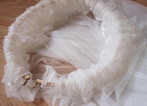 - Die drei Seiten des Tülls sollten an der Nähmaschine genäht werden, wobei die Kanten gedreht werden. Die vierte, lange Seite wird auf 3-4 cm heruntergebogen und auf die gleiche Weise genäht wie der Vorhang. Danach muss der Tüll an einem der Teile der Finger zum Sticken getragen werden.